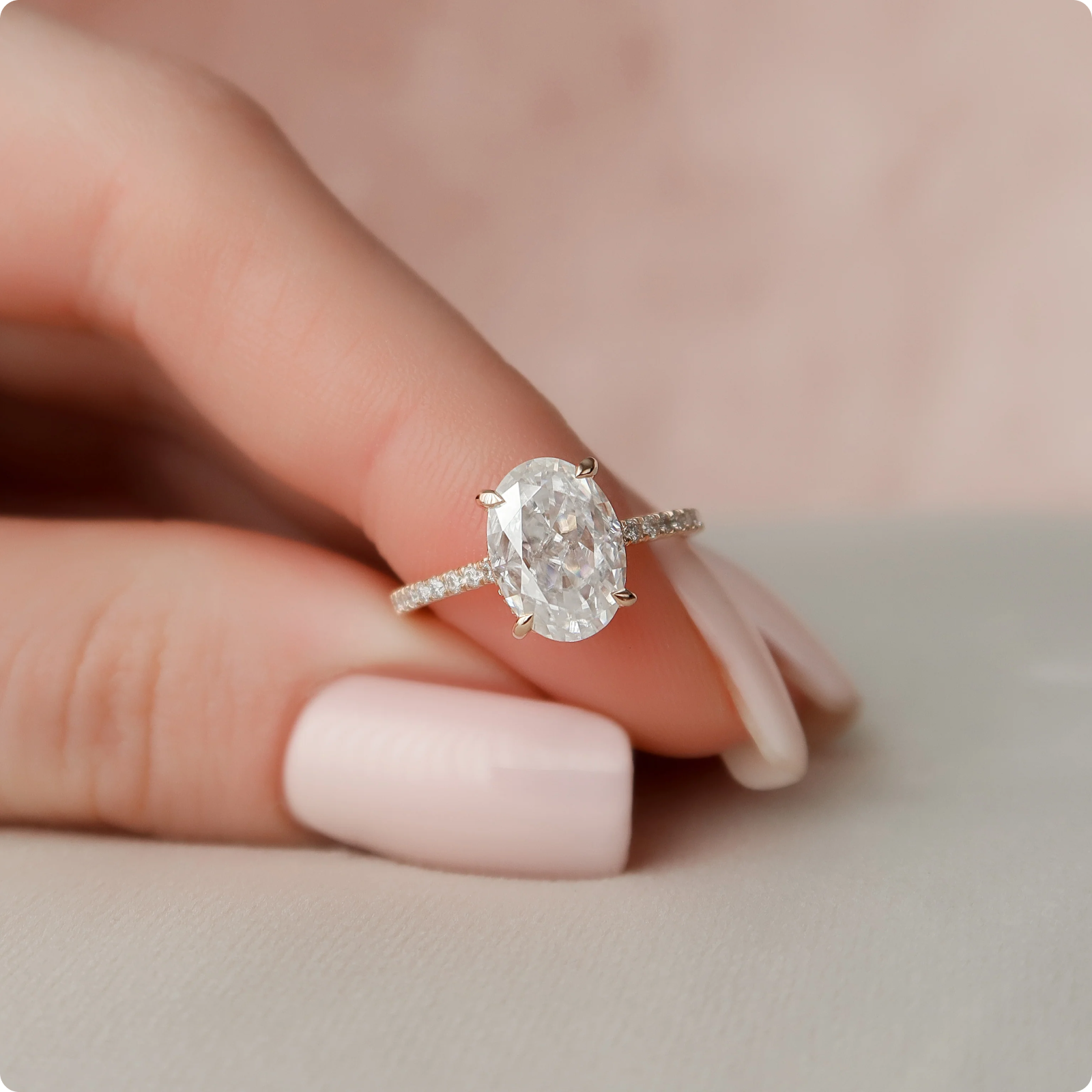 Glamour Moissanite with a 3-carat oval cut moissanite in rose gold